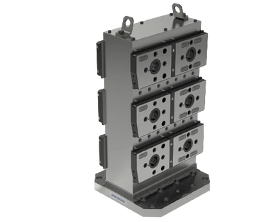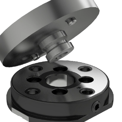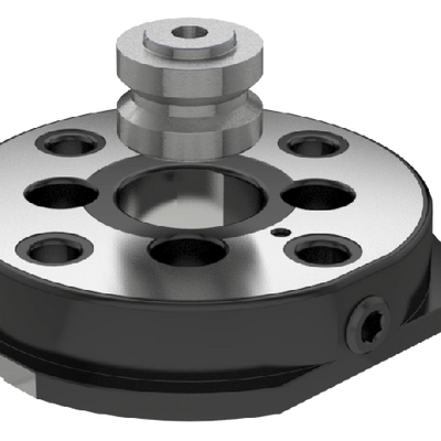Flat mechanical zero point clamping system with one solid locating bolt. There are two mechanical clamping versions, single round module or double rectangular module.